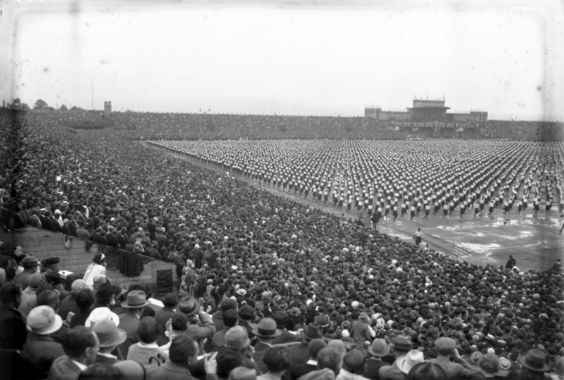 Prag’ın Strahov Tepesi’nde yer alan Great Strahov Stadyumu, futbol tarihi açısından bakıldığında her zaman tuhaf bir yerde durur. Bir dönem dünyanın en büyük stadyumu olarak anılan bu yapı, hiçbir zaman gerçek anlamda bir futbol mabedi olmadı. Kitabın da özellikle altını çizdiği gibi Strahov, futbol için fazla büyük; hatta futbolu neredeyse önemsizleştiren bir ölçekte tasarlanmıştı. Stadyumun büyüklüğünü tarif etmek gerekirse, normal bir futbol sahasından 9 tane bu stadyumun içine sığabiliyormuş. Şimdi bir kale arkasında otururken, diğer kale önünde ne pozisyon olduğunu göremediğiniz zamanları düşünün… Bu mesafeyi üç ile çarparsanız karşı tribünlerin ne kadar uzak olduğunu hayal edebilirsiniz.