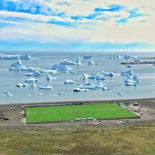 Qeqertarsuaq, Grönland’ın batısında, Disko Adası’nda (evet, bildiğiniz diskotek) küçük bir yerleşim. Haritada bakınca ulaşılması zor görünüyor ama buraya vardığında asıl zor olanın orada kalmak olduğunu fark ediyorsun. Hava sert, rüzgâr keskin, mevsimler kısa, en azından kış olmayanlar... Futbol sahası da bu koşulların ortasında, denizle buzun birbirine yaklaştığı bir noktada duruyor.