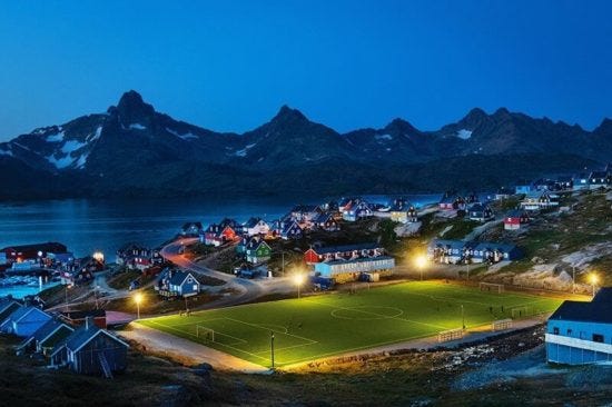 Grönland’ın doğusunda, yolların bittiği yerde başlıyor Tasiilaq. Buraya araba ile gidilmiyor; ya tekneyle ya da küçük pervaneli bir uçakla ulaşılabiliyor. Zaten bu stadyumu da “şehir içinde” düşünmek mümkün değil. Etrafında alıştığımız anlamda bir şehir yok; deniz, dağ ve sessizlik var. Futbol sahası ise bu üçlünün ortasında, sanki top oynansın diye düzlenmiş bir araziye kurulmuş.