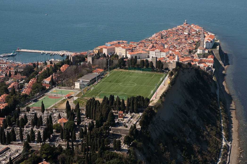 Hep suya yakındık, şimdi de biraz rakımı artıralım. Piran’daki bu futbol sahasını bulmak için tabeladan çok insanın yön duygusuna güvenmesi gerekiyor, hoş güneşli bi günde kafanızı kaldırsanız da olur. Dar sokaklar bittiğinde, kasaba bir anda aşağı doğru açılıyor. Pod Obzidjem Stadion tam burada, eski şehir surlarının dibinde, denizle kara arasındaki en dar hatta yer alıyor. Hatta Slovence’de ‘surların altındaki stadyum’ anlamına gelen bu ismin altını oldukça iyi dolduruyor. Bir tarafında taş duvar, diğer tarafında uçurum var.