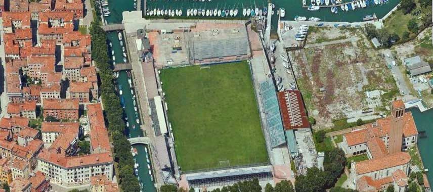 Stadio Pier Luigi Penzo, İtalya’nın en eski stadyumlarından biri, 1913 yapımı. Aynı zamanda Serie A’nın (yeniden çıktığı dönemlerde) en küçüklerindendi. Ölçeği ve kapasitesi mütevazıdır ama konumu fazlasıyla iddialı. Üç yanı lagünle çevrili bu saha, gelgitlerin ve fırtınaların etkisini doğrudan hisseder. 1970’lerde yaşanan büyük fırtınada tribünlerin ciddi zarar görmesi, Penzo’nun ne kadar kırılgan bir yerde durduğunu hatırlatan anlardan sadece biri.