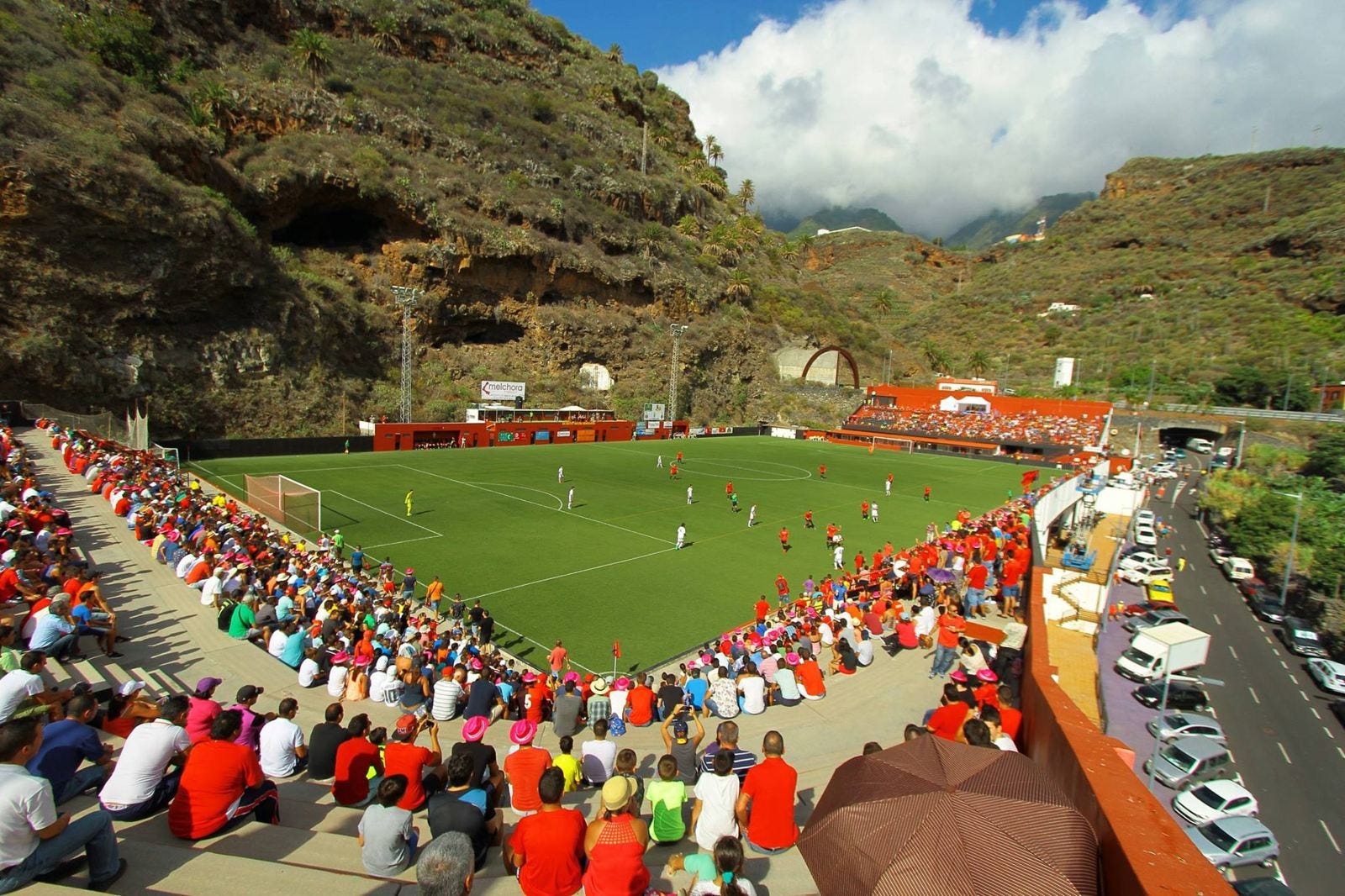 Saha, Barranco de los Dolores adlı vadinin kenarında yer alır. Tribünler klasik anlamda “karşılıklı” değildir; daha çok teras teras yükselen basamaklar gibidir. Yukarıdan bakıldığında futbol sahası değil de, bir yerleşimin parçası izlenimi verir. Burada mimari, manzaraya hükmetmeye çalışmaz; manzaranın içine karışır.