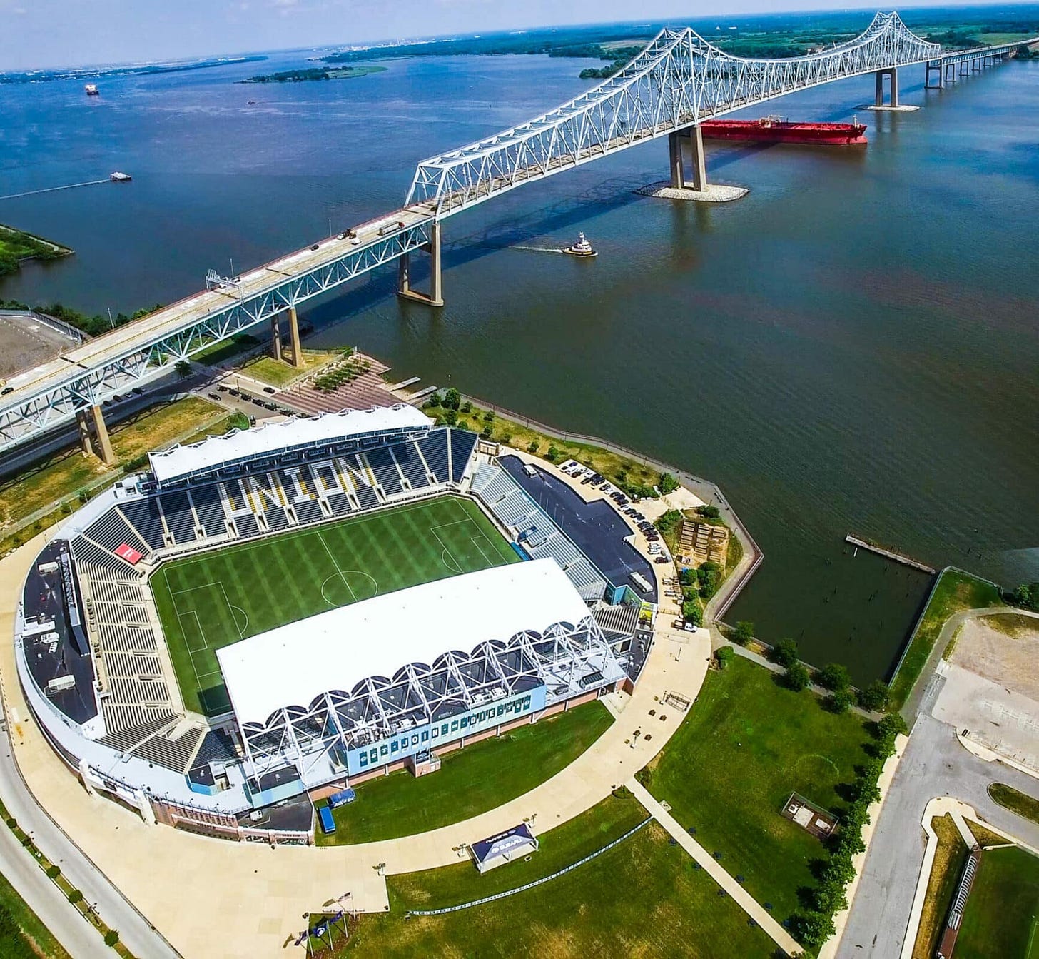 Stadyumun konumu, kitabın özellikle üzerinde durduğu noktalardan biri. Şehirden bilinçli olarak uzaklaştırılmış bu saha, otoyolun ve sanayi bölgelerinin arasından geçilerek ulaşılan bir yerde duruyor. Yaklaştıkça nehir görünür hâle geliyor; tribünlerin bir kısmı suya bakıyor. Maç sırasında arka planda geçen yük gemileri, bu sahayı diğer Amerikan stadyumlarından ayıran detaylardan biri.