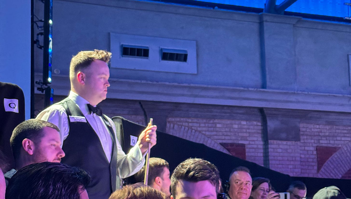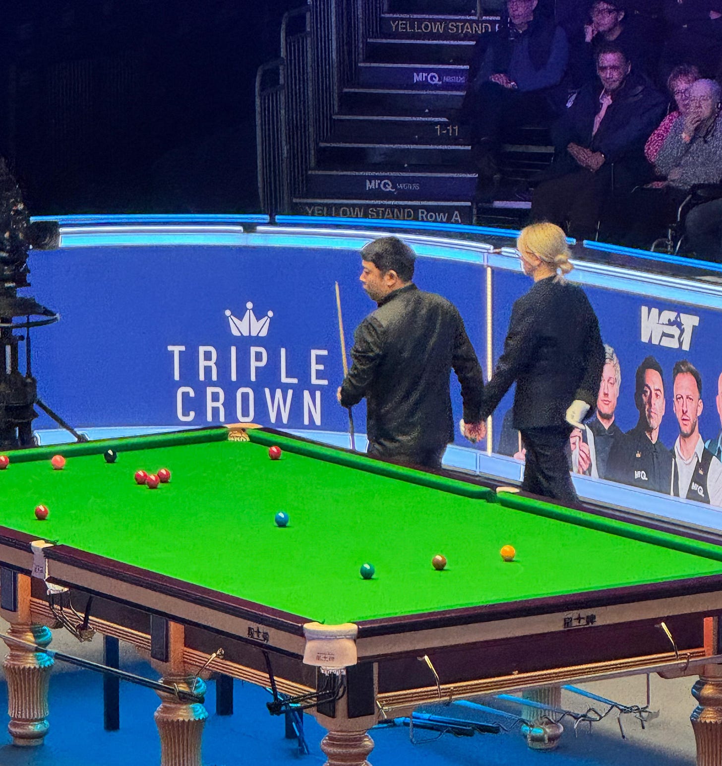 Maç günü izlenim ve deneyimlerimizle devam edelim bu bölüme… Maçın oynandığı bölüme girdiğimizde içeride tam bir snooker havası vardı. Daha önce Dünya Şampyionası’na ev sahipliği yapan Crucible Tiyatrosu’ndan edindiğimiz tecrübelerle kıyaslayınca alışık olduğumuz bir manzarayla karşılaştığımızı söyleyebilirim. Hemen girişte snooker masaları, lisanslı ürünlerin satıldığı bir WST (World Snooker Tour) standı, oynanan müsabakayı gösteren birçok ekran ve yemek/içecek alınabilecek şık bir bar. Sarayın eskiliğinden yakınan Ronnie’ye bazı noktalarda hak vermemek mümkün değil. Zira salonun içi soğuktu ve hafta boyunca ufak çaplı ‘haşerat krizleri’ ile uğraşıldı. Öyle ki Judd vuruş yaptığı sırada sırtında bir eşek arısı dahi vardı. Tribünlere çıktığımızda ise, sarayın iç yapısına uymayan bir şekilde taşınabilir tribünler ve bacak mesafesi oldukça kısa koltuklarla doluydu (Pegasus’a selam olsun). VIP diye nitelendirebileceğimiz bölüm ve hospitality’yi saymazsak tüm oturma yerleri eşit ve güzel görüş açısına sahipti.