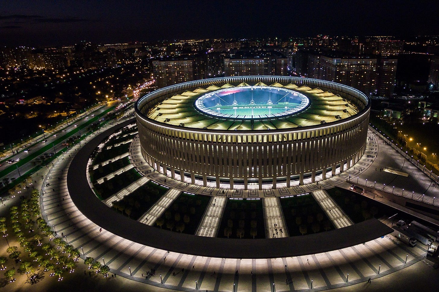 Rusya’nın güneyinde, Karadeniz’e yakın bir şehir Krasnodar. Soğukla değil, tasarımla övünen bir yer. Şehrin takımı FC Krasnodar’ın stadyumuysa tam bir mühendislik harikası. Dışarıdan bakınca uzay üssünü andırıyor ama içeriden Roma amfisinin dijital versiyonu gibi. Taş yerine cam, yankı yerine LED ekranlar.