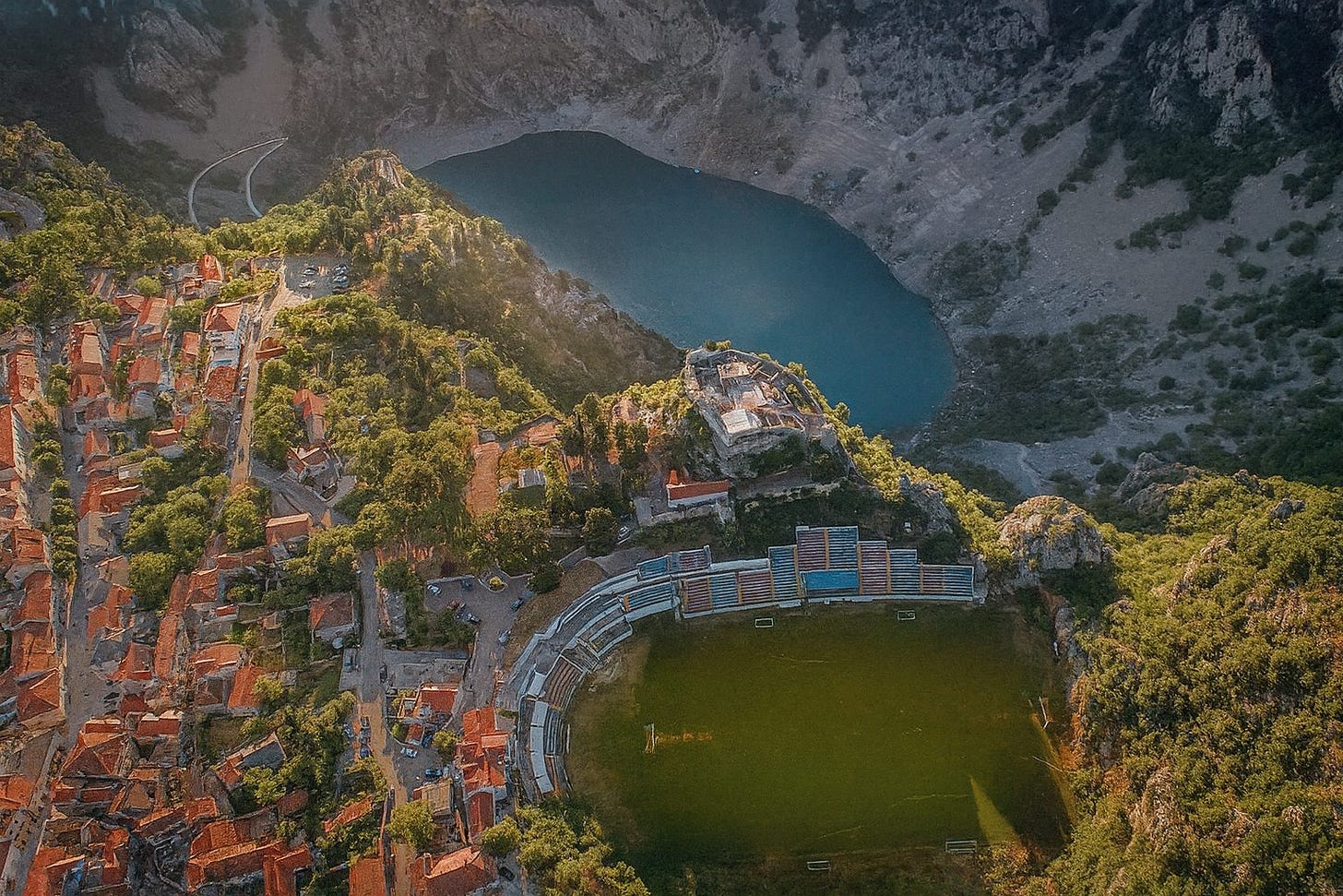 Hırvatistan’ın güneyinde, Imotski adında küçük bir kasaba var. Haritaya bakıldığında Adriyatik’e epey yakın ama içeriye gizlenmiş. İşte bu kasabada, dev bir kayanın kenarına bir stadyum inşa edilmiş: Gospin Dolac. Tribünlerin bir yanı uçurum, bir yanı da eski taş evlerle çevrili. Sahanın arkasında yüzyıllık bir kale kalıntısı yükseliyor; kalenin altındaysa masmavi bir krater gölü.