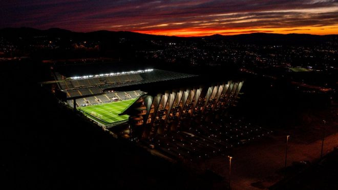 Bu stadyum 2004 Avrupa Şampiyonası için yapılmıştı. 30 bin kişilik kapasitesi var ama atmosferi o sayının çok ötesinde. Seyirci sesi granitten geri dönüyor, yankı her bağırtıyı iki katına çıkarıyor. Sanki doğa da tezahürata katılıyor. Ve her şeyden ilginci, bu yapının bir zamanlar taş ocağı olması. Aynı lokasyonda önce patlayıcılar atılmış daha sonra da isabetli paslar. Endüstriyel futbolun geldiği nokta tam olarak bu, aynı yer hem üretim hem oyun alanı olabiliyor.