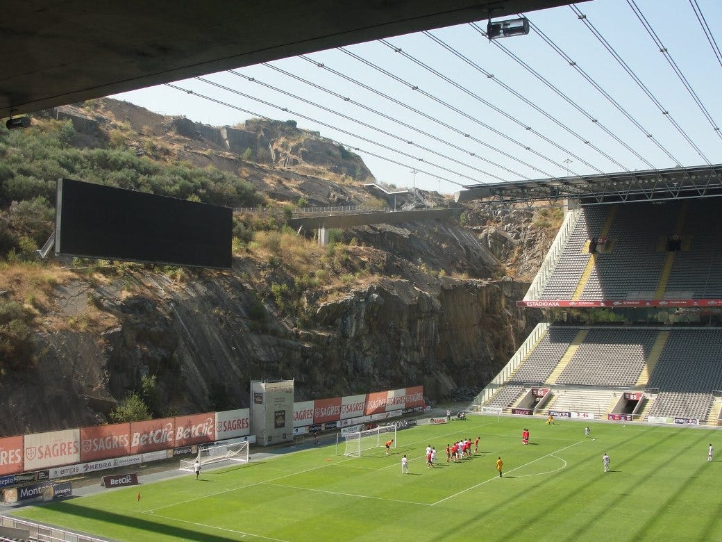 Portekiz’in kuzeyinde, Braga şehrinin kenarında bir dağın içi kesilip stadyuma dönüştürülmüş. İnsan ilk fotoğrafa bakınca “bunu kim, neden böyle yapmış?” diye soruyor. Cevap basit, mimar Eduardo Souto de Moura. Şehir yönetimi kendisinden yeni bir stadyum tasarlamasını istemiş, o da “madem dağın yamacındayız, neden dağı delmeyeyim, Ferhat da neticede delmişti?” diye düşünmüş olamaz tahminimce, Ferhat ile Şirin’in hikayesini bilmiyordur. Ortaya yarı doğa, yarı mühendislik harikası bir stadyum çıkmış.